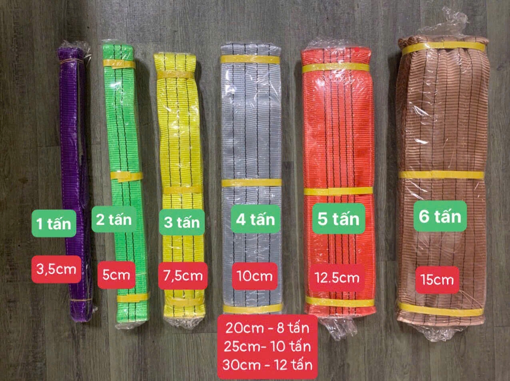 Cáp vải cẩu hàng được phân loại theo hình dạng và màu sắc, giúp người dùng dễ dàng nhận biết tải trọng.