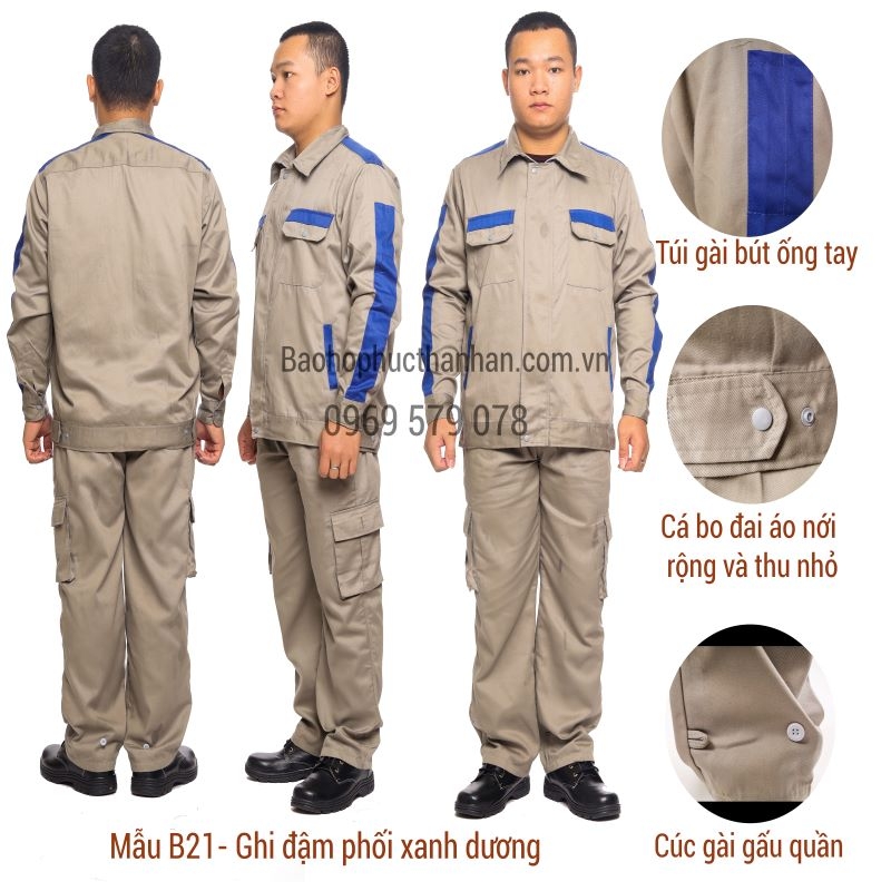 - Thiết kế: Áo dùng khóa kéo có nẹp che khóa, đai áo liền có 2 cá bo đai áo giúp nới rộng, thu nhỏ tùy theo ngoại hình và điều kiện làm việc. Áo có 2 túi ngực, 1 túi ống tay. Quần cạp chun co giãn 2 bên, 2 túi chéo, 2 túi hộp đùi, 1 túi hậu, gấu quần có cúc gài bo gấu gọn gàng, tránh vướng víu khi mặc lao động