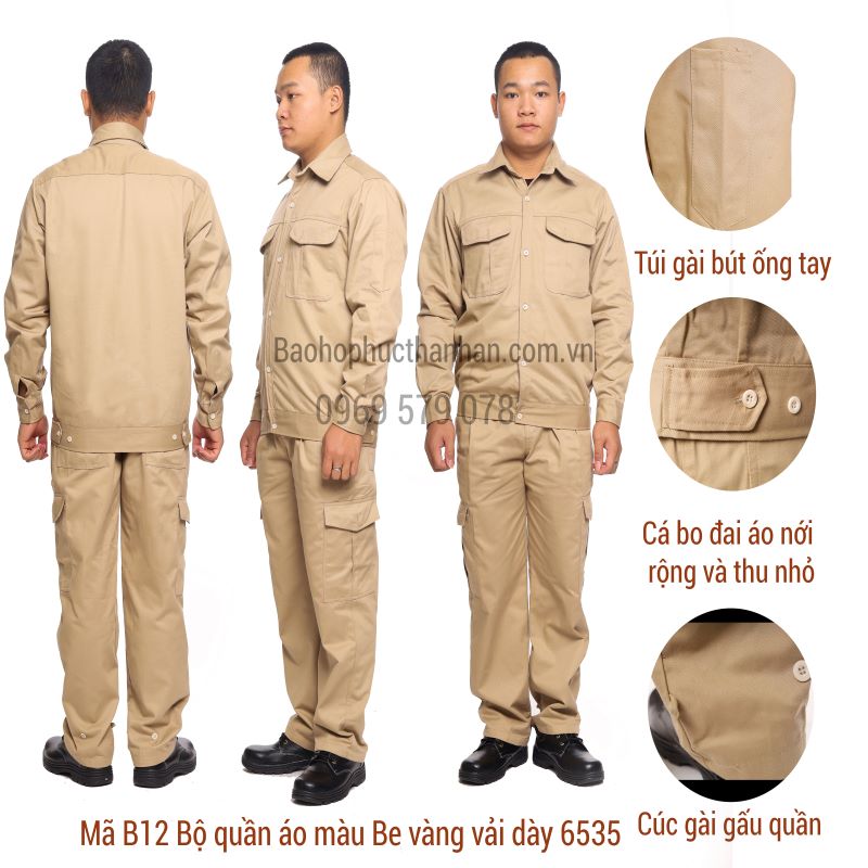 Quần áo bảo hộ lao động màu be là lựa chọn hoàn hảo dành cho công nhân, kỹ sư, thợ cơ khí, công nhân xây dựng và nhiều ngành nghề khác. Sản phẩm được may từ vải kaki 6535 với thành phần 35% cotton, 65% polyester, mang lại sự thoáng mát, bền chắc và thoải mái khi làm việc.