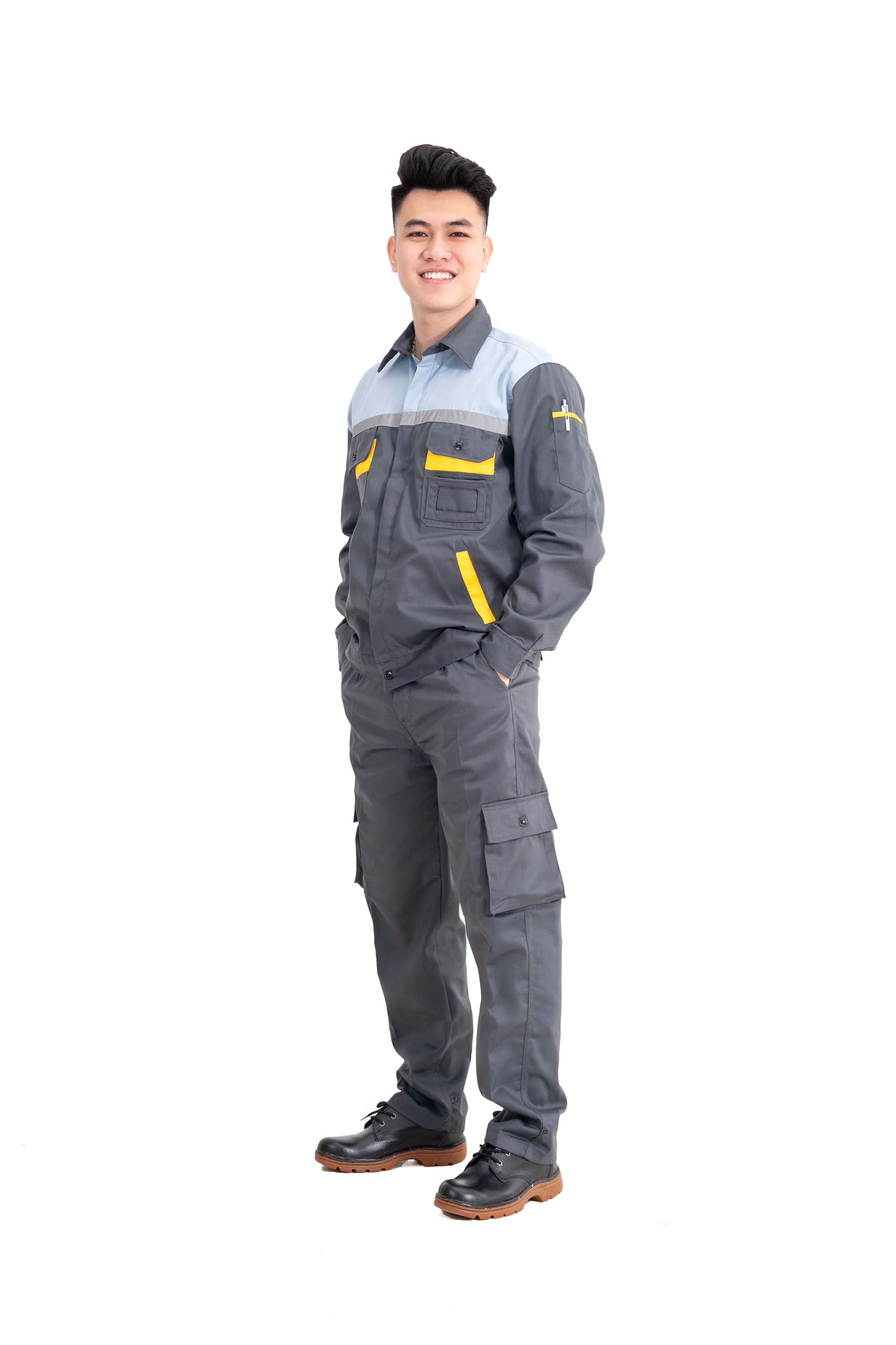 Bộ quần áo bảo hộ này có tone màu chủ đạo là màu chì kết hợp với màu xanh dương nhạt ở phần vai và điểm nhấn màu vàng tại các đường viền túi áo. Thiết kế phối màu hiện đại giúp người mặc không chỉ đảm bảo an toàn mà còn toát lên vẻ chuyên nghiệp trong môi trường làm việc.
