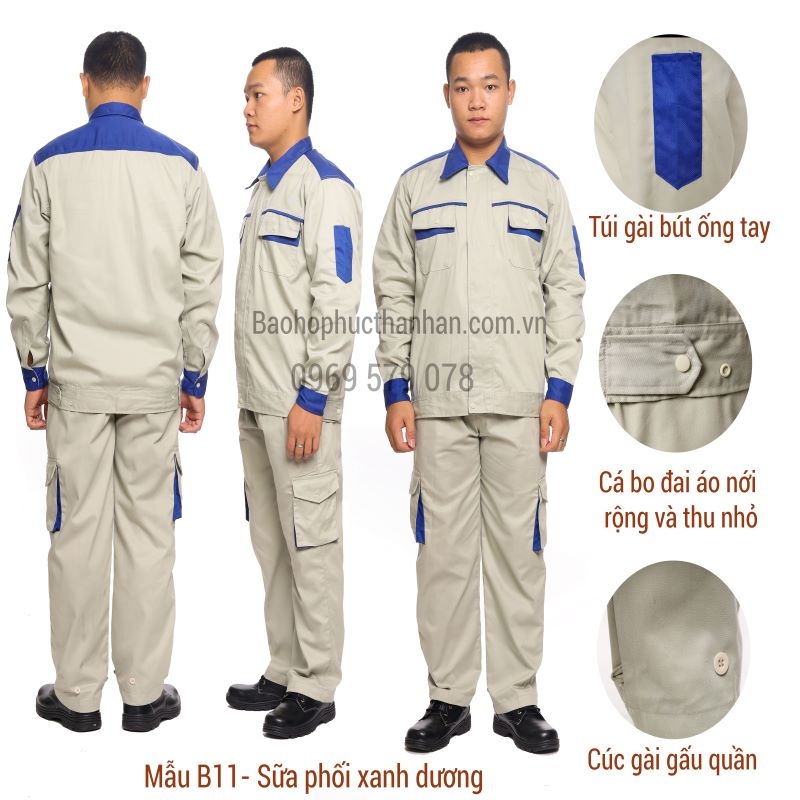 Áo khóa kéo có nẹp che khóa, đai áo liền có 2 cá bo đai áo giúp nới rộng, thu nhỏ tùy theo ngoại hình và điều kiện làm việc. Áo có 2 túi ngực, 1 túi ống tay.