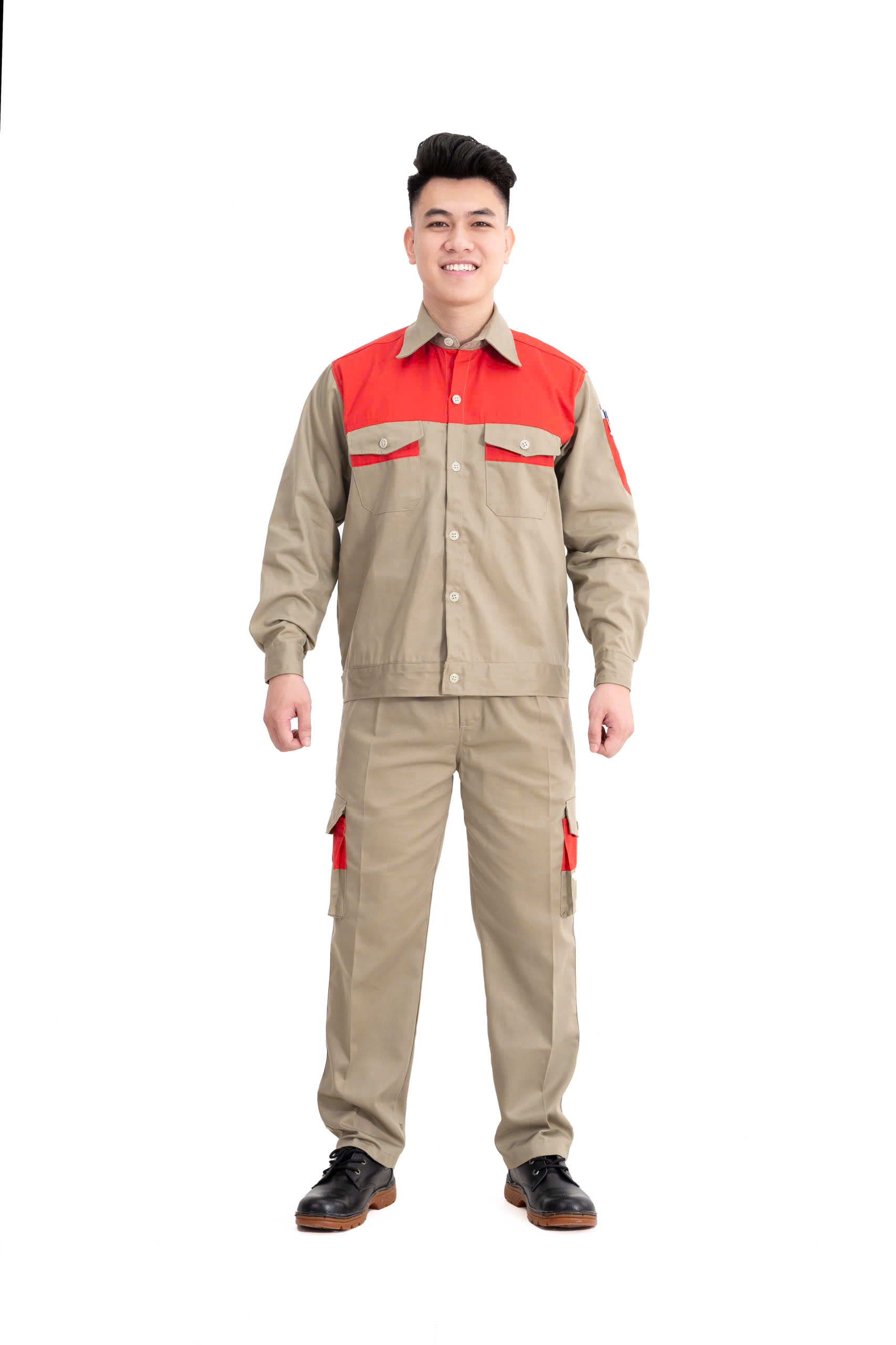 Quần áo bảo hộ lao động màu xám phối đỏ với chất vải kaki 31 dày dặn, thoáng mát, thấm hút mồ hôi, chịu mài mòn tốt